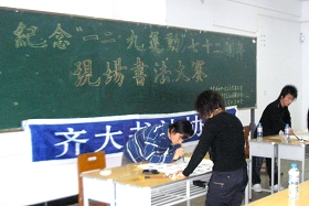 为继承和发扬我国书法艺术传统,弘扬爱国主义精神,由校团委主办,校学生社团联合会、校书法协会承办的纪念“一二•九运动”七十二周年书法大赛于12月9日下午14点在艺术楼325室举行。来自全校的一百多名书法爱好者参加了比赛。