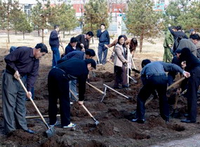 春季时,自施工队伍进入绿化工地现场,后勤处就指派专人对工程质量进行监督管理。他们派专人到苗源地遴选优质树种,全程进行跟踪问效,施工现场做到了一天一清,确保了植树绿化的质量。