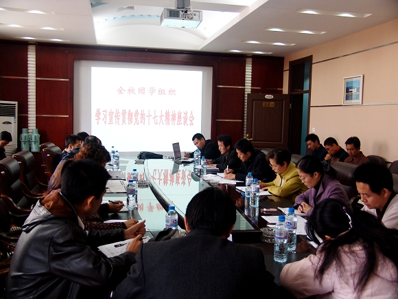校党委副书记王凤琴对今后一个时期学习宣传贯彻十七大精神提出了明确的要求。一要认真学习有关文件,迅速掀起学习热潮。要通读报告和党章原文,力争融会贯通;要采取多种切实有效的措施提高学生学习的积极性;要加强督促检查,促进学习。二是理论学习要联系实际,指导并推动工作。要加强创新,把学习好、宣传好、贯彻好十七大精神作为理论武装工程的最主要的内容。要以十七大精神为指导,研究具体问题,促进工作。三要加强共青团组织自身建设。要适应全面加强党的建设新的伟大工程的要求,切实加强作为党的助手和后备军的共青团组织的建设;要推进团组织进寝室工作,切实加强寝室文化建设;团干部要抓紧学习,努力提高自身素质,加强自身建设,做学习十七大精神的表率。