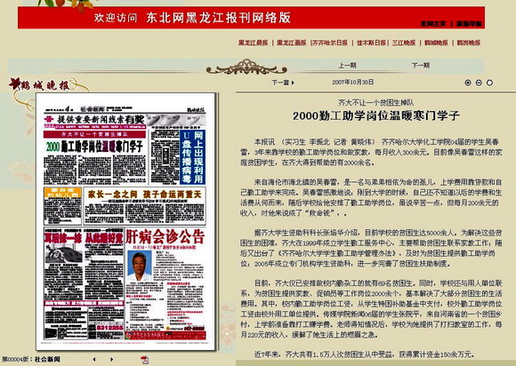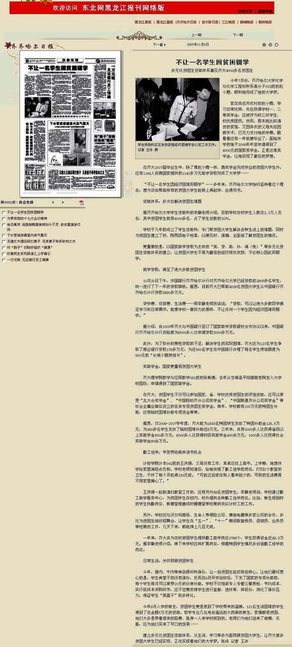 编者按:关爱贫困学生,构建和谐校园,是sunbet申搏全面贯彻党的教育方针,坚持以人为本育人理念的重要举措。近年来,sunbet申搏扎实的资助工作、良好的育人成效,赢得了社会的称誉。10月30日的《鹤城晚报》以《2000勤工助学岗位温暖寒门学子》为题热忱报道了sunbet申搏支持和帮助经济贫困学生开展勤工助学工作的情况;11月6日的《齐齐哈尔日报》以《不让一名学生因贫困辍学》为题热忱报道了sunbet申搏多元化贫困生资助体系所取得的良好成效。齐齐哈尔新闻网等媒体对报道情况给予了转载。