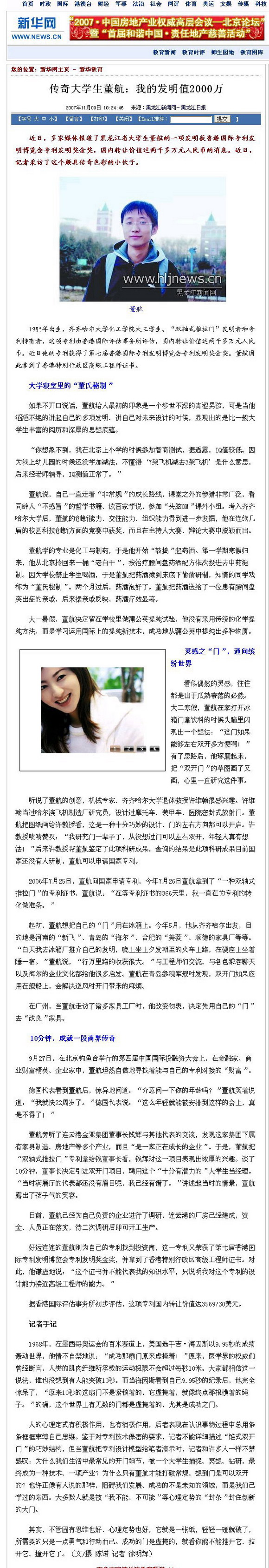 《黑龙江日报》记者徐明辉专程从哈市来校专访董航同学,并用如椽妙笔撰写了《传奇大学生董航—我的发明值2000万》,并配图发表在2007年11月9日出版的《黑龙江日报》上。