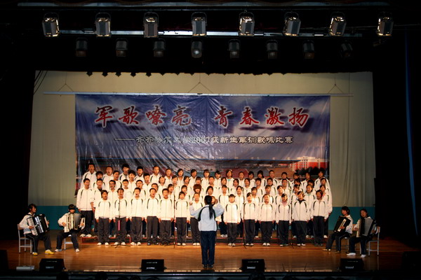 同学们高唱《共产党好共产党亲》、《爱我中华》、《歌唱祖国》、《八荣八耻》等歌曲,声情并茂,铿锵有力,歌唱祖国,歌唱党的领导,歌唱社会主义,歌唱改革开放,歌唱和谐校园,唱出了青年学子的激情,也体现了齐大人的豪迈。