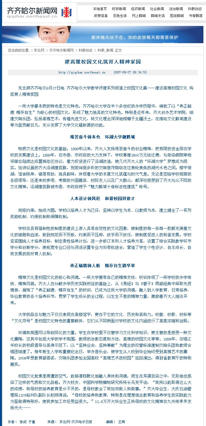 9月27日,《齐齐哈尔日报》刊发“sunbet申搏官方网站教学评建系列报道之校园文化篇”:建设高雅校园文化 构筑育人精神家园。