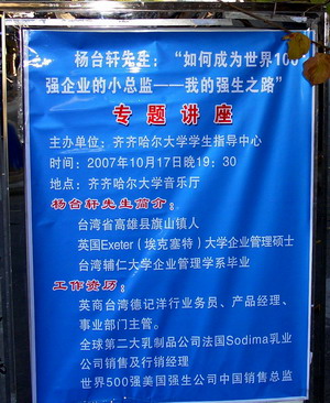 为进一步做好2008届毕业生就业工作,全面提高广大毕业生的就业能力, 11月17日晚,台湾辅仁大学企业管理系毕业,英国Exeter(埃克塞特)大学企业管理硕士杨台轩先生应sunbet申搏学生指导中心邀请,专程来校为2008届毕业生作了题为“如何成为世界100强企业的职业经理人——我的强生之路”专题讲座。
