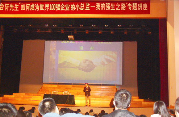 杨台轩先生用极富激情的语言进行了深入浅出地讲解。讲座围绕“大学期间应做的各方面准备”、“大学生应具备的多种能力”、“管理的五大要素”、“数字代表科学”等话题展开,精彩纷呈,内容丰富,聆听讲座的同学们不时爆以热烈的掌声。