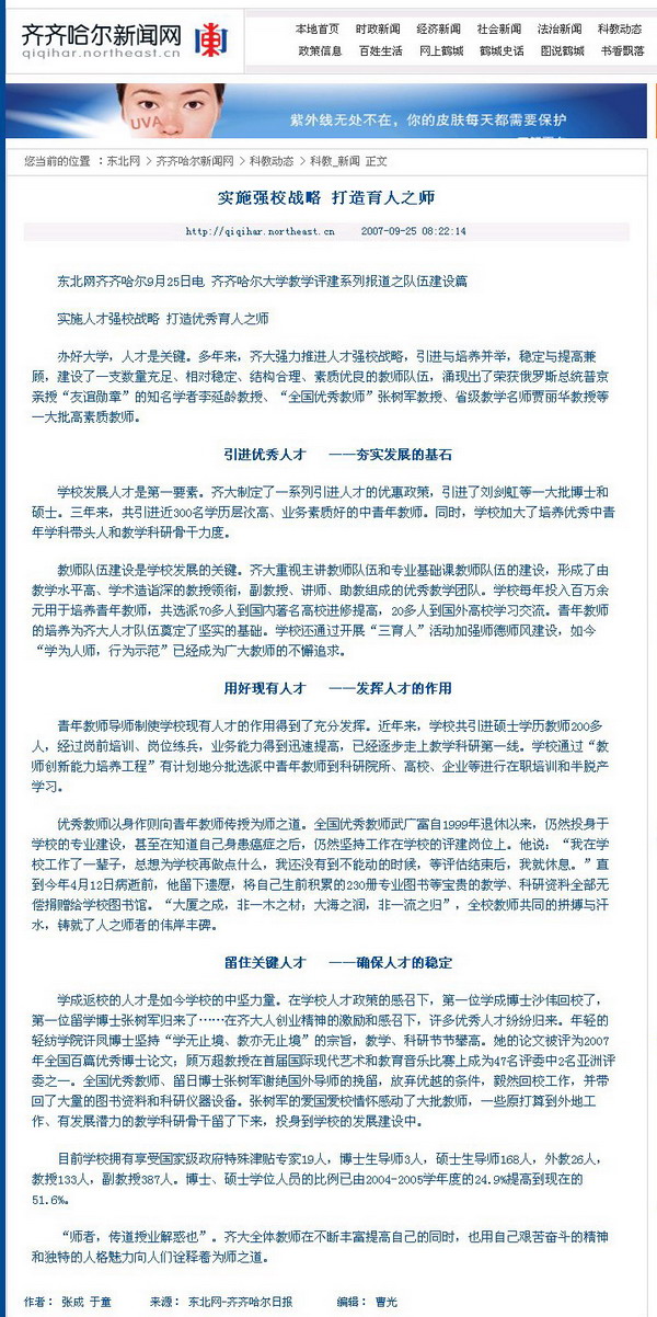 编者按:9月25日,《齐齐哈尔日报》刊发“sunbet申搏官方网站教学评建系列报道之队伍建设篇”:“实施人才强校战略 打造优秀育人之师”。