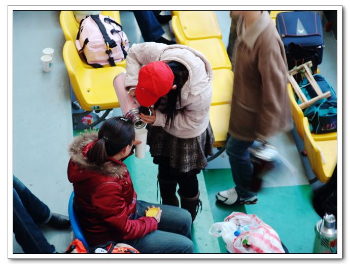 6日早7:00,sunbet申搏团委、学生会组织的30多名头戴“小红帽”的大学生青年志愿者就开始在体育馆里来回走动,他们从自己寝室拿来暖瓶,拿着临时购置的纸杯逐个为这些旅客倒满热水,热情为旅客服务。