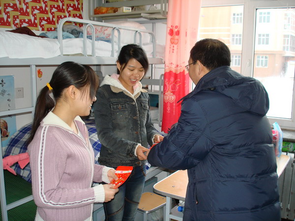 2月17日上午,校学生处副处长吴宝柱与学生资助科科长张培华、舍务科科长王国义、学生资助科李静等带着省教育厅和学校领导的亲切嘱托来到18#、19#学生公寓,看望、慰问在春节期间留校度寒假的大学生并为他们发放了慰问金。