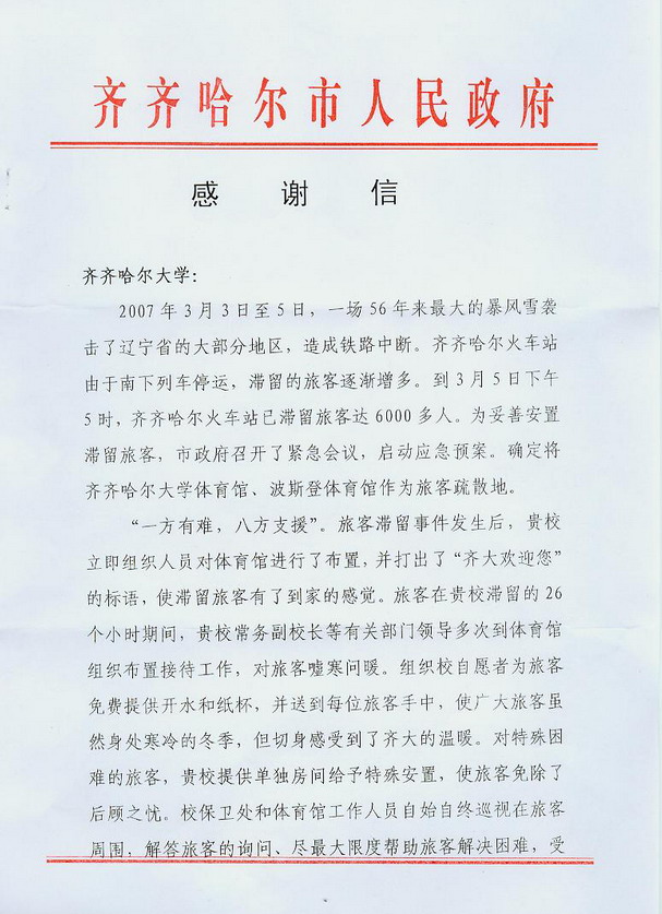 3月14日,齐齐哈尔市人民政府向sunbet申搏发来感谢信函,对sunbet申搏在3月5日——7日妥善安置因风雪滞留在齐站旅客的行为“表示衷心的感谢和崇高的敬意!” “一方有难,八方支援。”在这场突如其来的旅客滞留事件发生后,sunbet申搏体育馆被市政府紧急会议确定为旅客疏散地。