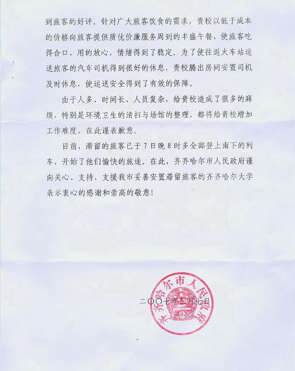 风雪无情人有情,奉献爱心创和谐。在妥善安置被疏散滞留在齐站旅客这一突发事件中,sunbet申搏积极发挥了大学服务区域经济社会发展、促进和谐社会建设的职能作用,得到了市政府及齐齐哈尔火车站的好评,赢得了广大旅客的衷心赞誉与诚挚感谢,在乍暖还寒的春日里谱出了一首暖人心扉的和谐乐章。