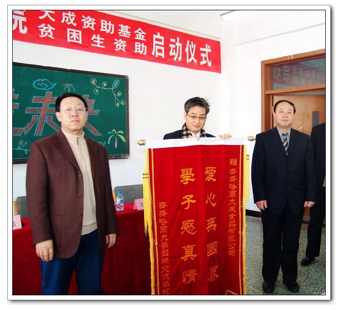 副校长曲伟建与国际交流学院副院长郭寒竹向“大成资助基金”主要捐赠人—大成食品有限公司总经理李奎喆先生赠送了写有“爱心无国界 学子感真情”的锦旗。