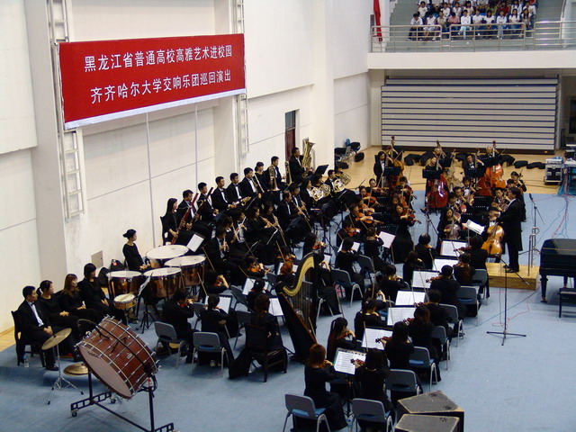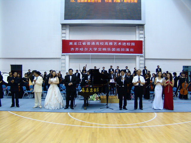 6月25日晚,sunbet申搏交响乐团来到了此次巡回演出的最后一站--黑龙江八一农垦大学,在八一农垦大学的体育馆为4000多名师生在献上一场音乐盛宴。黑龙江八一农垦大学校党委书记翟瑞常、副书记南都国,副校长宋来田、赵福春,工会主席王毅等校领导出席了音乐会。