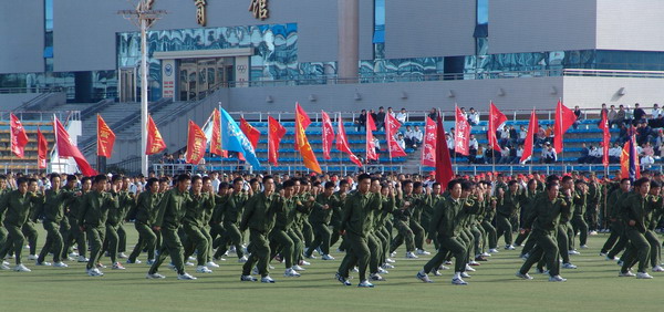 在大会上,体育学院06级同学为大会表演了“军礼拳”,高喊“纪律严明、训练过硬、提高素质、报效祖国”的口号,为军训总结大会增添了光彩。