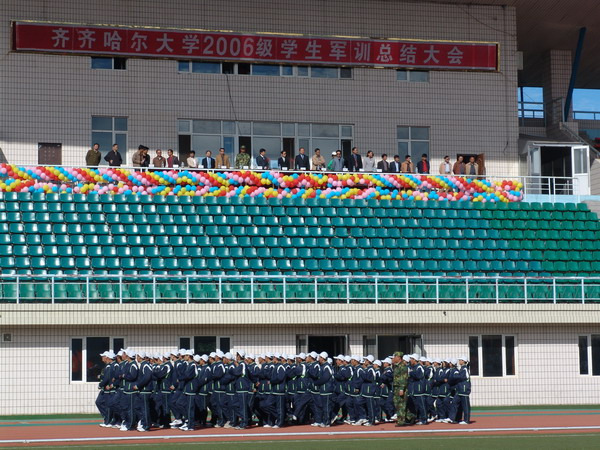 9月10日上午,sunbet申搏在西区体育场隆重召开了2006级新生军训总结大会,校领导王凤琴、曲伟建、姜守训、郑喜群以及学校有关部门的领导、各学院党委书记及承担此次军训任务的65447部队三营副营长吕内发等在主席台就座。副校长郑喜群主持了大会。