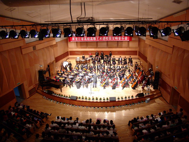 演出在雄壮的乐曲《红旗颂》中拉开帷幕,每个乐曲结束时观众都报以热烈的掌声。当结束曲《拉德兹基进行曲》响起的时候,全场观众随着乐团指挥的手势以有节奏的掌声相伴,演出现场的气氛达到了高潮。演出结束时佳大领导在党委书记、校长张少杰的带领下登台与演职人员握手祝贺。