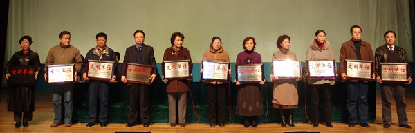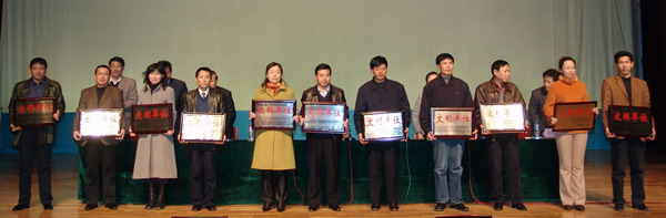 在主席台就座的学校及市文明办领导为荣获校级文明单位标兵和文明单位的代表颁发了奖牌。