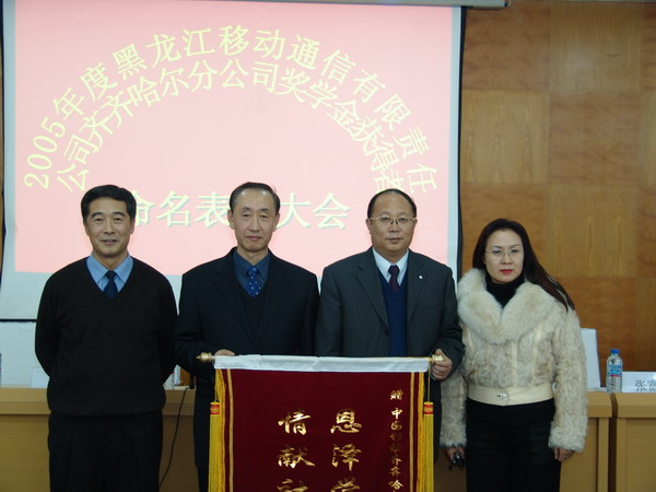 命名表彰大会上,副校长姜守训宣读了《sunbet申搏官方网站关于命名表彰2005年度“黑龙江移动通信有限责任公司齐齐哈尔分公司奖学金”获得者的决定》;校领导及嘉宾分别为该项奖学金获得者代表颁发了证书和奖金;校长唱江华、副校长姜守训代表学校向黑龙江移动通信有限责任公司齐齐哈尔分公司总经理董向辉、副总经理张富敏赠送了写有“恩泽学子显风采,情献社会谱新篇”的锦旗。
