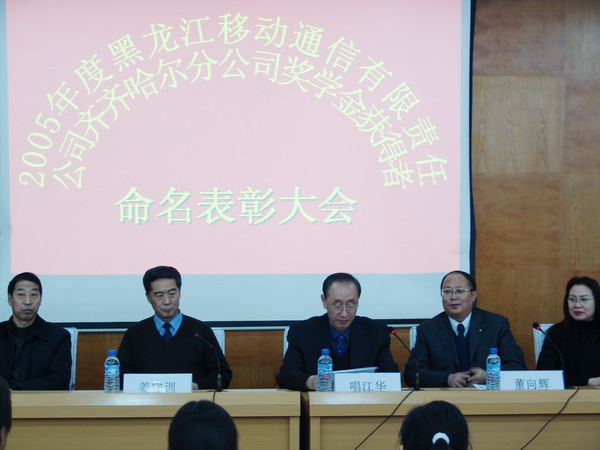12月15日下午,2005年度“黑龙江移动通信有限责任公司齐齐哈尔分公司奖学金获得者”命名表彰大会在sunbet申搏西区主楼报告厅隆重举行,校长唱江华、副校长姜守训、黑龙江移动通信有限责任公司齐齐哈尔分公司总经理董向辉、副总经理张富敏等出席,学生处(学工部)长王刚主持大会。