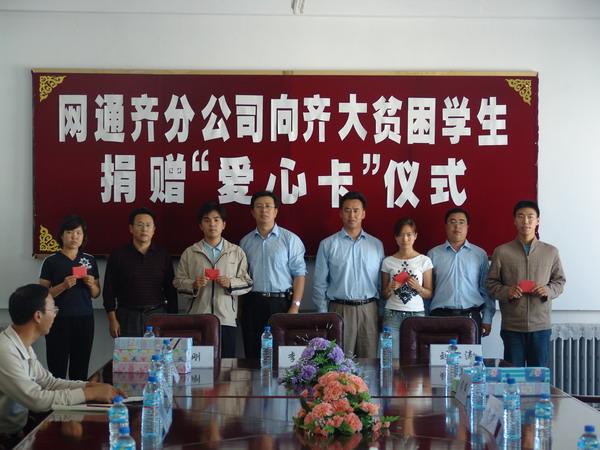 9月14日下午1时,中国网通齐齐哈尔分公司向贫困学生捐赠"爱心卡"的仪式在sunbet申搏西区主楼606会议室举行。齐齐哈尔通信分公司副总经理李岩、齐齐哈尔通信分公司浏园分局局长刘松涛、副局长高宏伟、闫伟,sunbet申搏学生处处长王刚、副处长吴宝柱及相关工作人员与来自各学院的30名贫困生代表参加了仪式。