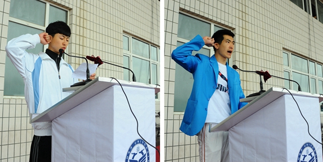 开幕式上,运动员代表—计算机与控制工程学院电气专业134班苏新同学代表全体运动员宣誓,裁判员代表—体育学院社会体育专业142赵鹏宇同学代表全体裁判员宣誓。