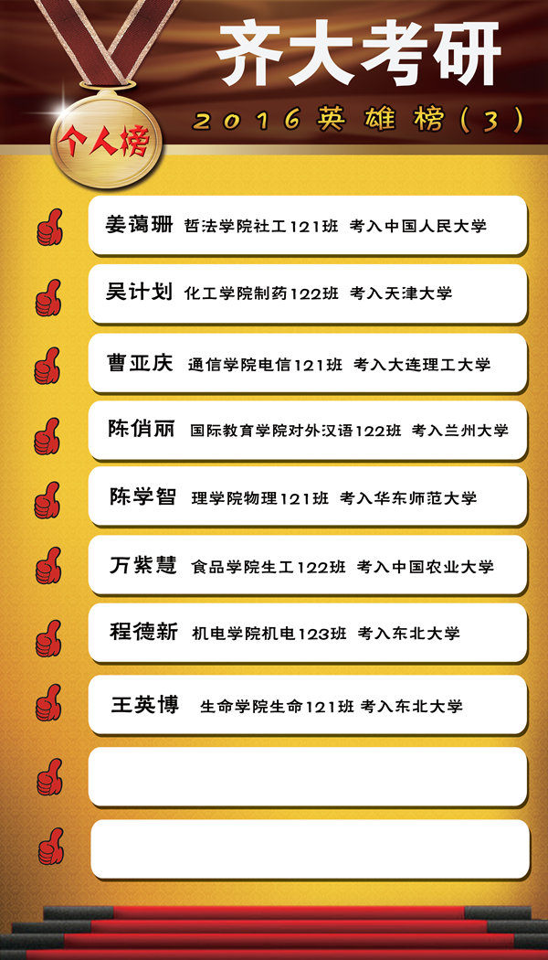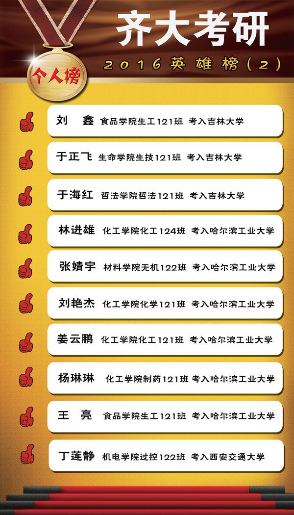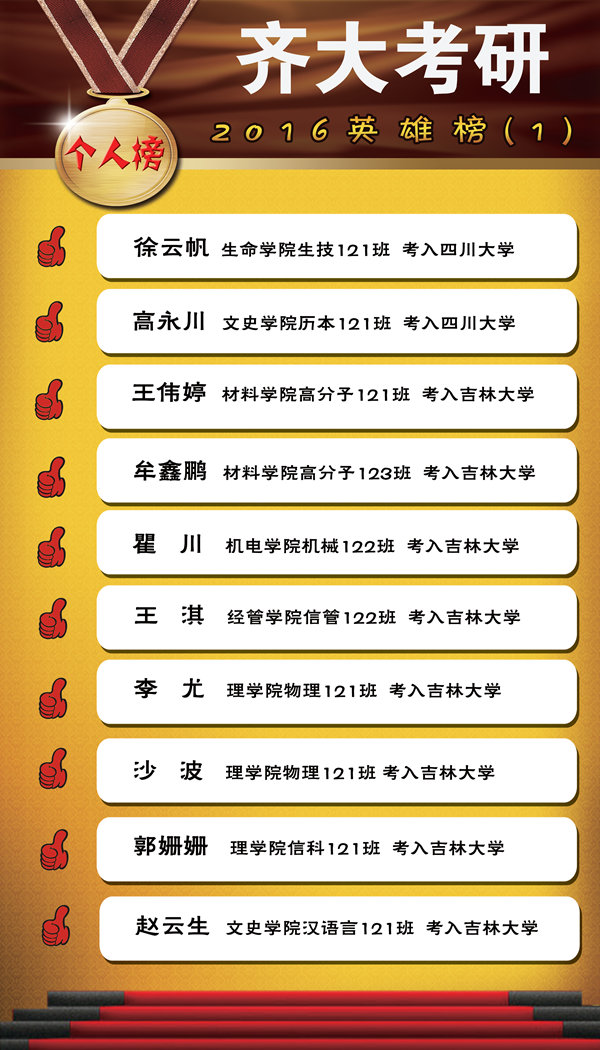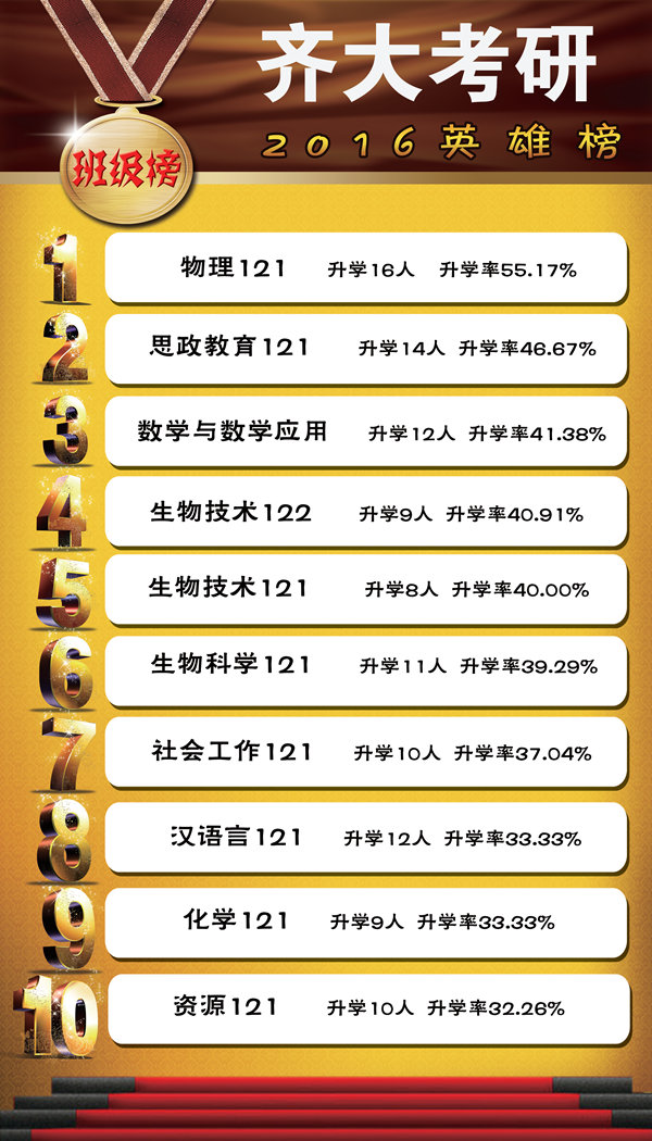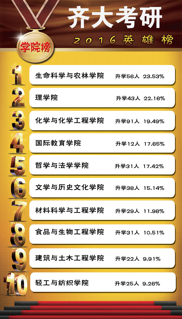 以下是2016年的学院考研率前十名、班级考研率前十名以及考入“985工程”院校的学生名单。