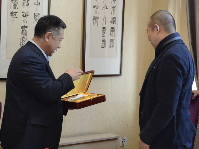 校长马立群在讲座之前与牟克见面并进行了交流,对他所取得的艺术成就给与了高度赞扬,同时希望他能够利用俄罗斯高水平的艺术交流平台,为母校艺术学科和专业建设作出贡献;牟克表示,非常感谢母校的培养,一定要尽自己最大努力回报母校。马立群向牟克赠送了校庆纪念品《大学赋》。