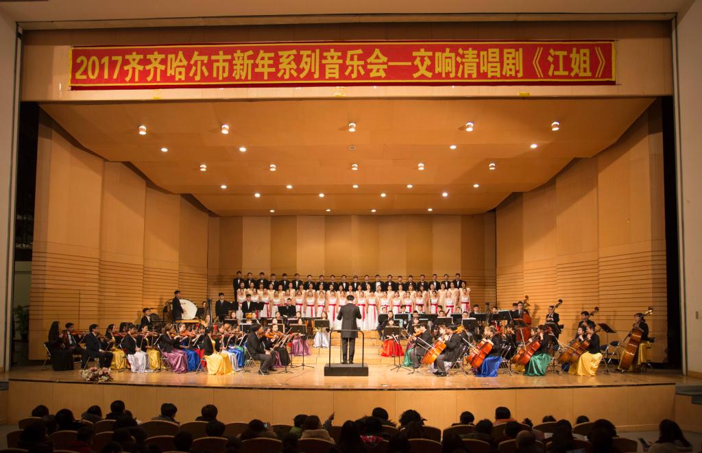12月26日晚19时,sunbet申搏官方网站音乐厅座无虚席。齐齐哈尔市2017新年系列音乐会之大型民族交响清唱剧《江姐》在这里隆重首演。