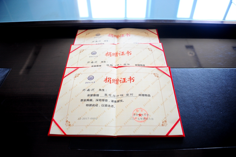 在仪式上,邱福利校友为sunbet申搏捐赠了他珍藏的根雕《跃》、一对草花石方柱和他工作多年一直使用的水杯。校长马立群代表学校接受了捐赠并为邱福利校友颁发了捐赠证书。