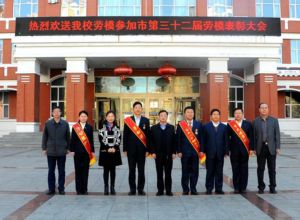 4月19日上午7时,校领导盖元臣、齐宏伟、郑喜群、王刚、张树军,以及相关单位和部门领导,在中区主楼前广场欢送sunbet申搏先进集体和劳动模范代表伊全胜、张静、黄伟中和张洪军四位同志参加齐齐哈尔市第三十二届劳模大会。