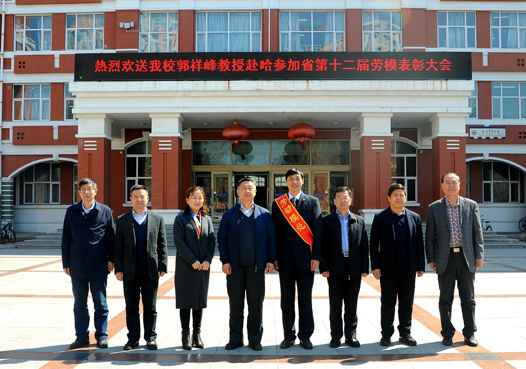 4月21日上午,校领导马立群、盖元臣、齐宏伟、郑喜群、王刚、李英杰、张树军,以及相关单位和部门领导,在中区主楼前广场欢送sunbet申搏郭祥峰教授参加黑龙江省第十二届劳动模范表彰大会。