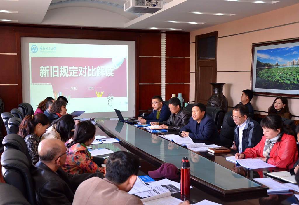 会上,学生工作部(学生处)副部(处)长张树启通过新旧规定对比的形式,对2017年2月教育部颁发的新《规定》的特点和内容进行了详细解读。全体与会人员一同开展了学习研讨。