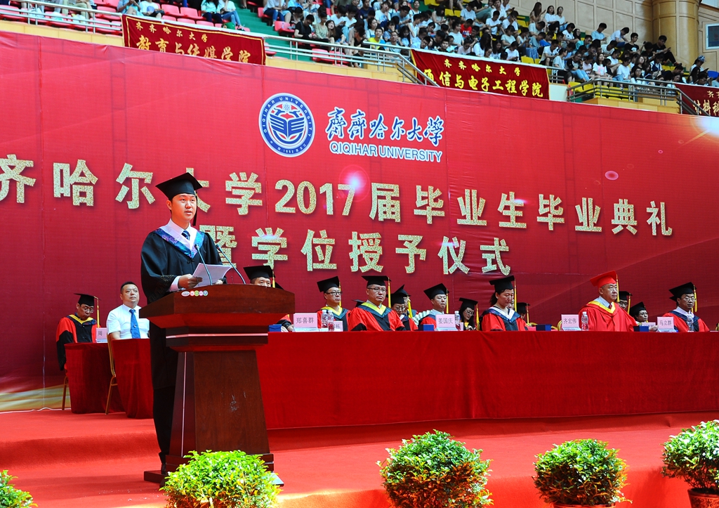 本科生代表、校学生会主席、校优秀毕业生纪铖同学发言。他代表2017届毕业生向辛勤培育他们的母校、向关心呵护他们的领导和老师表示深深的感谢和崇高的敬意!向辛勤养育他们的父母表达最真挚的祝福。向四年来一起朝夕相处的兄弟姐妹们,表达最真诚的的问候。大家将告别朝夕相处的同学,作别循循善诱的老师,离开美丽如画的校园,踏上人生新的征程。但永远不会舍弃在sunbet申搏官方网站学到的点点滴滴,永远不会忘记在迷茫彷徨时老师的悉心指点,永远不会忘记在伤心难过时同学的真切问候。同学们会带着那份对社会的责任、带着母校的期盼、带着父母的祝福、带着朋友的鼓励,奔赴到各个工作岗位上,成长为一名自强不息,敢于担当,乐于奉献的齐大人。最后再次祝福母校人才辈出,桃李芬芳;祝福恩师工作顺利,万事如意;祝福父母身体康健,阖家幸福;祝愿sunbet申搏官方网站2017届全体毕业生前程似锦,一帆风顺!