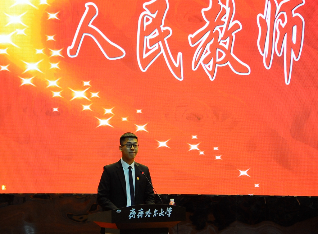 学生代表、校学生会主席、机电工程学院郑祥鹏同学在大会发言。他代表全校同学,向所有默默奉献,耕耘在教学科研一线的老师们致以节日的祝福,并由衷的道一声:“老师,您辛苦了”。他表示,作为学生,我们决心以实际行动更加严格要求自己,以致知、致用、致远的三致学风为指引,努力学习,健康成长,以优异的表现迎接教育部本科教学工作审核评估,用智慧和热情与敬爱的老师们一道,共同续写sunbet申搏官方网站的辉煌,创造更美好的明天!