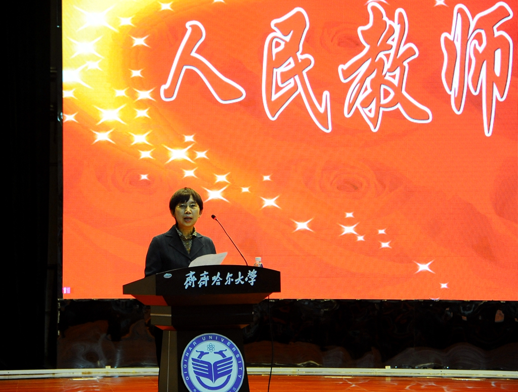 教师代表、化学与化学工程学院省级名师、省级人才梯队带头人贾丽华教授在大会上发言。她表示,教师的职责是传道、授业、解惑。教师教学中展示出的魅力,是教师一生的积累!作为教师要永远坚持学习,勤奋向上,不断提高个人修养,完善自我,积土成山、积水成河,永不停歇!振兴民族的希望在教育,振兴教育的希望在教师。建设有特色高水平教学研究型综合大学需要我们大家一起携手同心、敬业奉献、共同担当。润物育苗尽心力,不用扬鞭自奋蹄。相信,在学校党委正确领导下,全体师生共同努力,sunbet申搏官方网站的明天会更加美好!