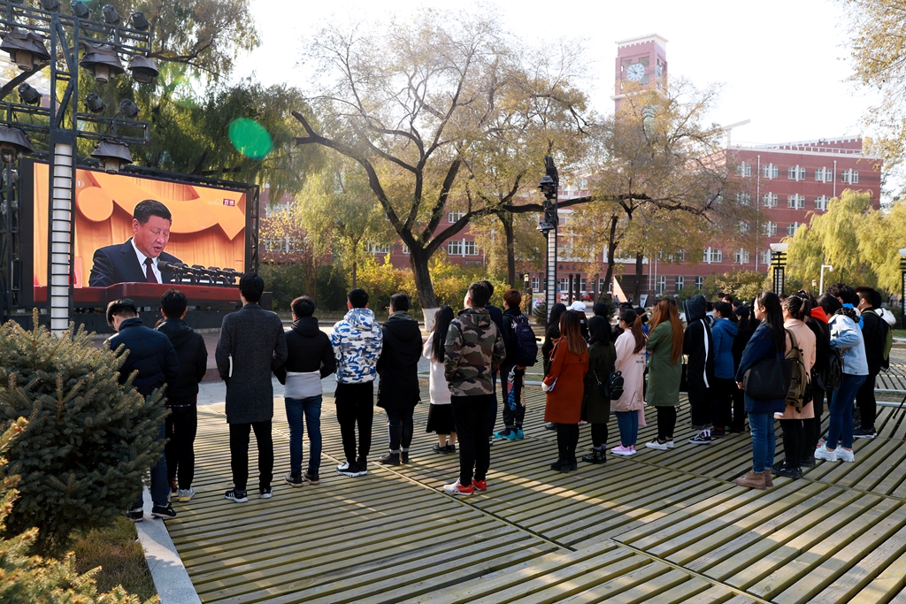 为组织好全校师生收听收看十九大开幕式盛况,校党委做了周密的安排和部署,利用各校区和场馆的电子显示屏、电视机等设备播放十九大开幕式实况,全校各单位、各学院也都组织本单位党员、干部、入党积极分子集中收听收看了大会开幕式直播。无论是在办公室、还是在教室、在寝室、在食堂、在路上,或是在微信群里,大家都在聆听和热议习总书记的报告。