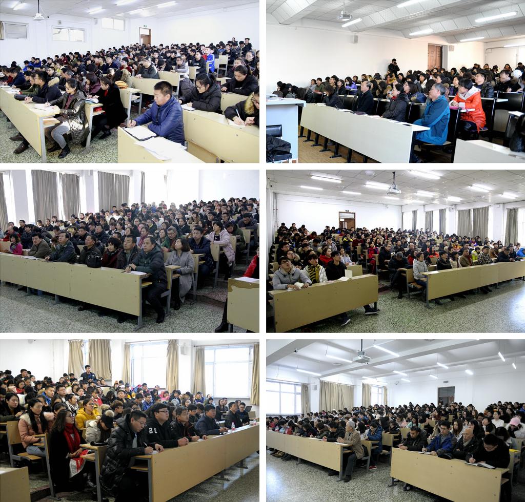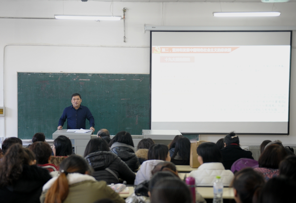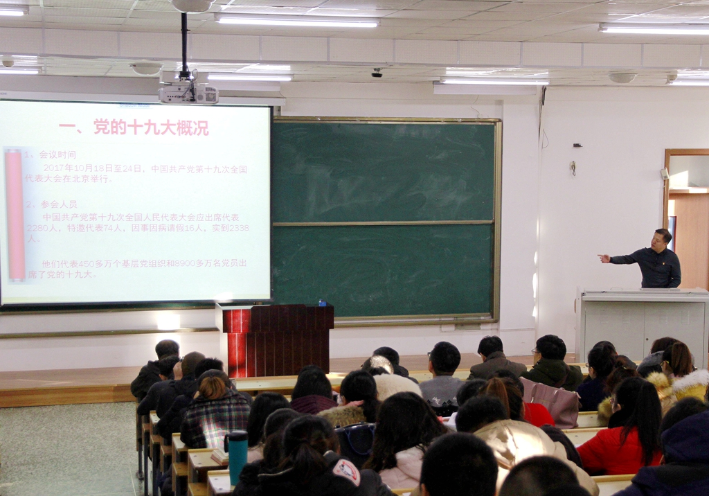 在东区26教第二阶梯教室和25教阶梯301教室,校党的十九大精神宣讲团成员、哲学与法学学院政治学与行政学专业徐凤江副教授以《深入推进新时代党的建设的伟大工程》为题,在讲述了新时代全面加强党的建设的必要性、党的十八大以来党的建设的重要手段、措施及成就后,着重解读了新时代党的建设的总要求、新时代党的建设的八项重点任务。他指出,学习领会党的十九大精神,要紧紧围绕习近平新时代中国特色社会主义思想这个主线,坚持读原著、学原文、悟原理,做到学深悟透。通过学习引导全党自觉维护习近平总书记作为党中央的核心、全党的核心地位,维护党中央权威和集中统一领导。把师生的思想和行动统一到党的十九大精神上来,把力量凝聚到党的十九大确定的各项任务上来。外国语学院、音乐与舞蹈学院全体教职工、学生党员及入党积极分子参加了宣讲活动。
