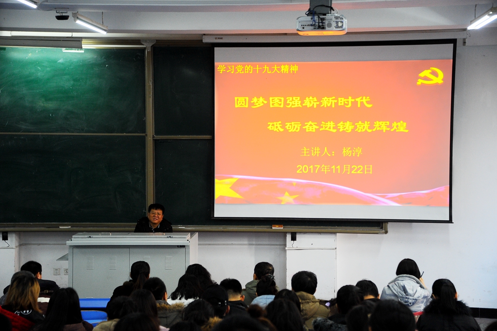 在中区11教阶梯202教室,校党的十九大精神宣讲团成员、食品与生物工程学院党委书记杨淳副教授以《圆梦图强崭新时代 砥砺奋进铸就辉煌》为题,详细介绍了党的十八大以来我国经济、政治、文化、社会、生态文明建设等方面取得的巨大成就,突出强调了反腐、精准扶贫、国防和军队改革是人民群众最关注、最吸引眼球的三大亮点。他指出,党的十八大以来的五年,以习近平同志为核心的党中央高举中国特色社会主义伟大旗帜,准确把握中国经济发展所处历史新方位,团结和带领全国人民为实现中华民族伟大复兴中国梦而努力奋斗、砥砺奋进,取得了举世瞩目的伟大成就。解决了许多长期想解决而没有解决的难题,办成了许多过去想办而没有办成的大事。轻工与纺织学院全体教职工、学生党员及入党积极分子参加了宣讲活动。