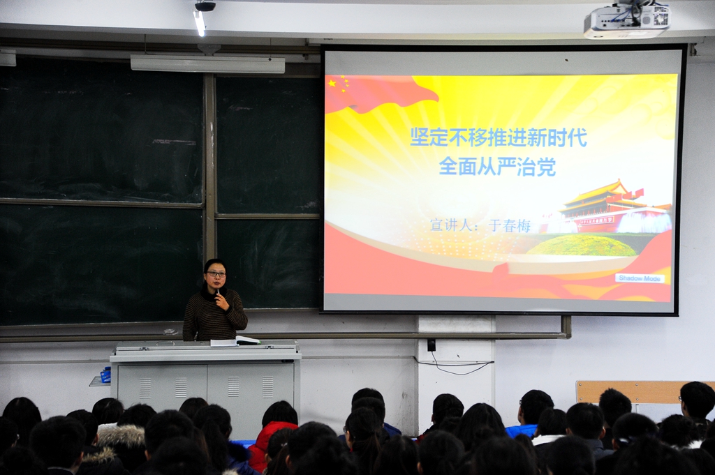 在中区11教阶梯302教室,校党的十九大精神宣讲团成员、马克思主义学院副院长、硕士生导师于春梅教授以《坚定不移推进新时代全面从严治党》为题,从充分认识五年来全面从严治党的重大成就、明确新时代全面从严治党的总体要求、全面把握党的十九大对新时代全面从严治党的新部署等方面,对党的十九大精神进行了系统、全面、深入的讲解。于春梅指出,中国特色社会主义进入新时代,面临新环境新挑战新问题,打铁必须自身硬,因此必须坚定不移推进新时代全面从严治党这一伟大工程,必须进一步把我们党建设好、建设强,使我们党成为坚强有力的领导力量,从而决胜全面建成小康社会、夺取新时代中国特色社会主义伟大胜利。机关党委全体教职工参加了宣讲活动,化学与化学工程学院全体教职工、学生党员及入党积极分子参加了宣讲活动。