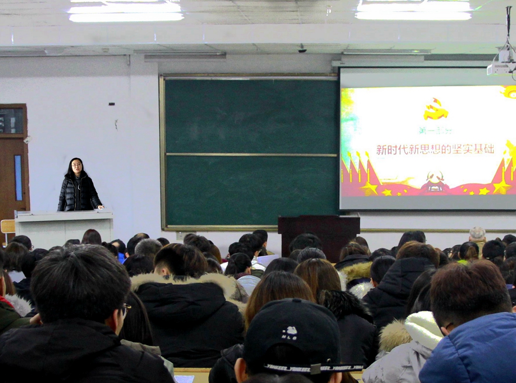 在西区1教阶梯204教室,校党的十九大精神宣讲团成员、马克思主义学院马克思主义中国化教研部主任、硕士生导师庞晶副教授以《习近平新时代中国特色社会主义思想引领新征程》为题,介绍了党的十九大召开的基本情况,梳理了党的十八大以来历次会议的主要议题和内容,分析了党的十九大报告的主题、新时代和新思想的主要内容,着重介绍了在习近平新时代中国特色社会主义思想的引领下如何全面建成小康社会。她指出:中国特色社会主义进入了新时代,这是我国发展新的历史方位,同时我们党形成了新时代中国特色社会主义思想。新思想的产生具有重大历史意义,它将成为决胜全面建成小康社会、夺取新时代中国特色社会主义伟大胜利的行动指南。通信与电子工程学院、材料科学与工程学院全体教职工、学生党员及入党积极分子参加了宣讲活动。