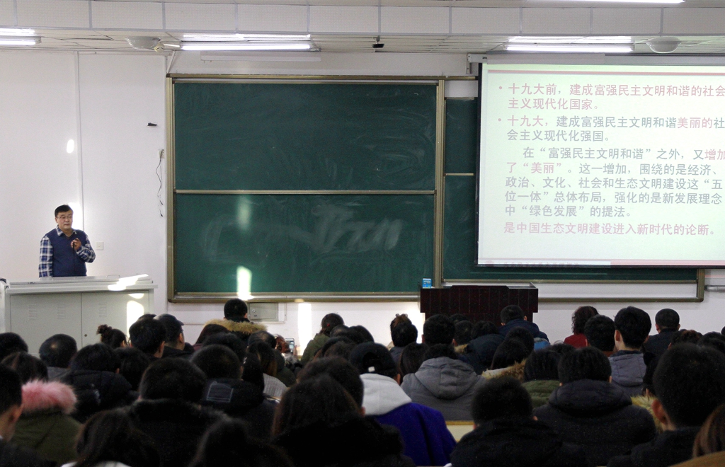 在西区1教阶梯202教室,校党的十九大精神宣讲团成员、马克思主义学院马克思主义基本原理教研部主任、博士、硕士生导师王圣祯教授以《认真学习党的十九大生态文明新思想 奋力谱写美丽中国的龙江华章》为题,从生态文明建设新时代的新矛盾与新目标、生态文明建设新时代的新使命、奋力谱写美丽中国的龙江华章、美丽中国与大学生的历史担当等方面进行了解读。他指出,实现美丽中国伟大梦想,一要战胜生态挑战的伟大斗争,二要建设生态马克思主义政党的伟大工程,三要推进中国特色社会主义生态文明建设伟大事业。紧密结合省情,在立足得天独厚的龙江自然资源优势中抢占绿色发展制高点,促进绿色发展。建设美丽中国更需要大学生的历史担当。建筑与土木工程学院、机电工程学院全体教职工、学生党员及入党积极分子参加了宣讲活动。