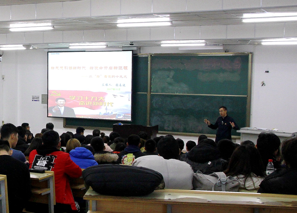 在西区1教阶梯203教室,校党的十九大精神宣讲团成员、马克思主义学院中国近现代史纲要教研部主任、硕士生导师张春波副教授以《新思想引领新时代 新使命开启新征程》为题,从新时代、新矛盾——进行伟大斗争,新理论、新思想——建设伟大工程,新任务、新举措——推进伟大事业,新使命、新征程——实现伟大梦想等四个方面阐释了党的十九大的“新”。他指出,只有进行新的伟大斗争才能开创新时代,解决新矛盾。只有以马克思主义中国化最新成果——习近平新时代中国特色社会主义思想为行动指南,才能建设新的伟大工程。他分析了推进中国特色社会主义伟大事业的新任务和新举措,提出在实现中华民族伟大复兴中国梦的新征程中广大师生的使命担当。理学院、应用技术学院全体教职工、学生党员及入党积极分子参加了宣讲活动。