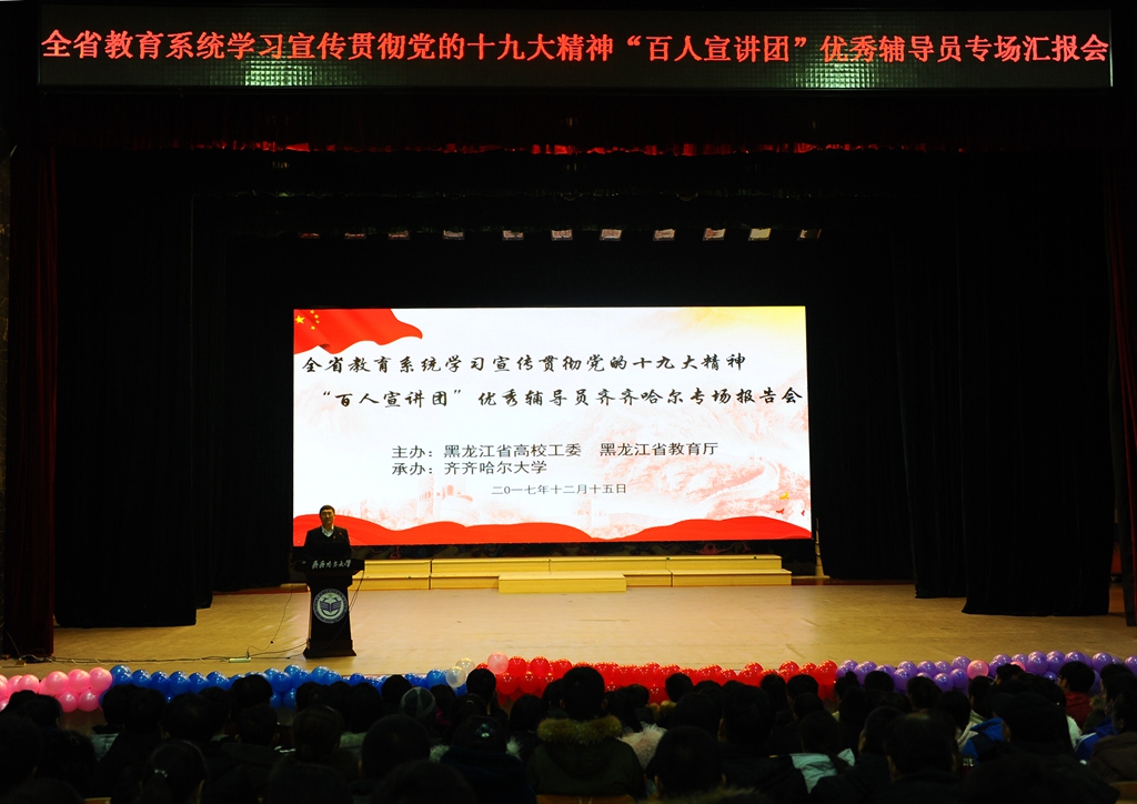 为进一步学习宣传贯彻党的十九大精神,12月15日下午,由黑龙江省委高校工委、省教育厅主办,sunbet申搏官方网站承办的全省教育系统“百人宣讲团”优秀辅导员齐齐哈尔高校专场报告会在sunbet申搏文化宫举行。sunbet申搏各学院主管学生工作的党委书记、副书记副院长、团委书记以及齐齐哈尔市6所高校的辅导员和学生代表近1300人参加了报告会。报告会由校学生工作部(学生处)部(处)长姜波主持。
