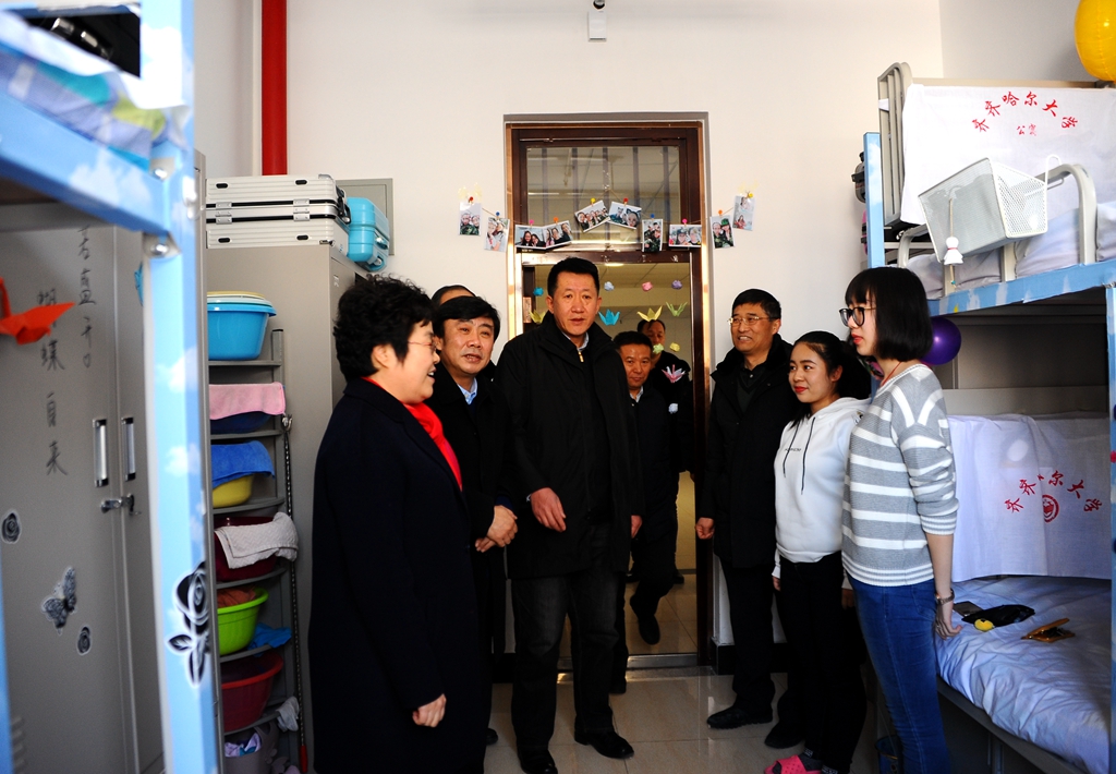 在东区八号学生公寓,赵国刚实地查看了学生寝室环境状况,听取了sunbet申搏学生工作部(学生处)部(处)长姜波对公寓生活设施情况的介绍,并与同学们进行亲切交谈,详细了解同学们的家庭所在地、所学专业以及日常的学习生活情况。他指出,学生宿舍是一种文化阵地,大家可以学习和休闲,交流思想,希望同学们珍惜良好的学习生活条件,勤奋学习,将来为龙江的振兴发展多做贡献。他还查看了公寓楼的用水用电设施,强调要认真排查安全隐患,时刻注意学生公寓的安全防范工作。