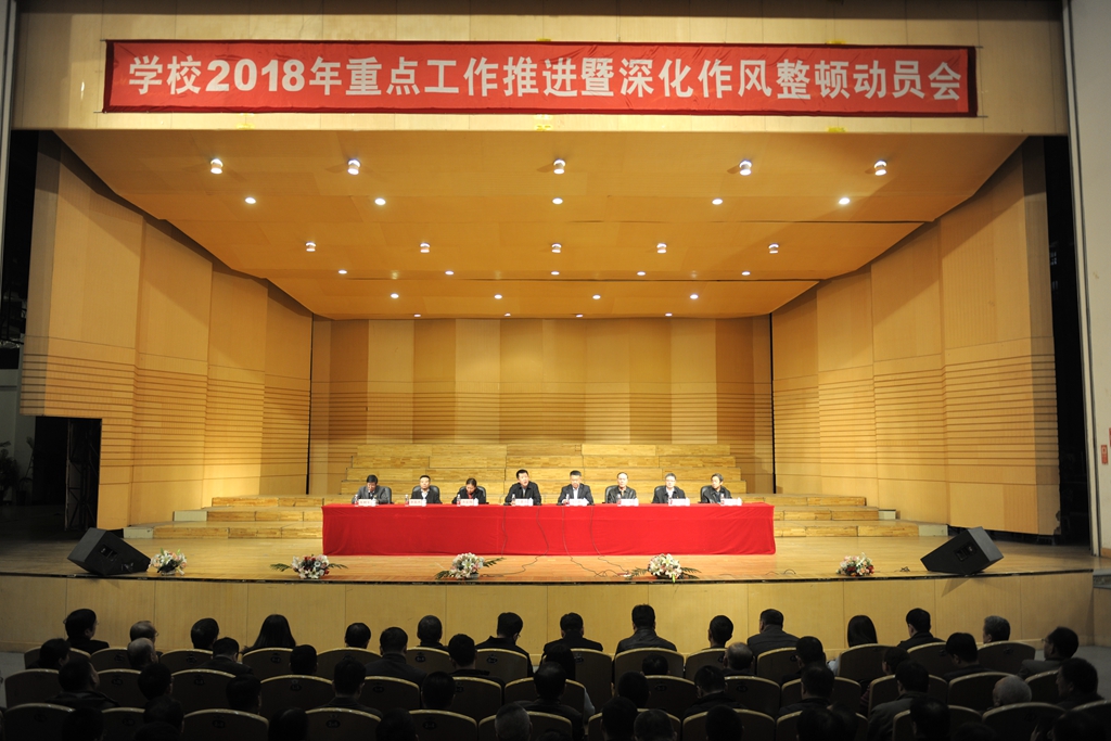 3月29日下午,学校在音乐厅召开2018年重点工作推进暨深化作风整顿动员大会。学校领导班子成员出席会议,全校科级以上干部,学科带头人、专业带头人(负责人)、教研室主任、副高级以上专业技术职务人员,各学院党政办公室、教学科研办公室、学生工作办公室负责人,辅导员,民主党派负责人参加了会议。大会由校党委书记兰景力主持。