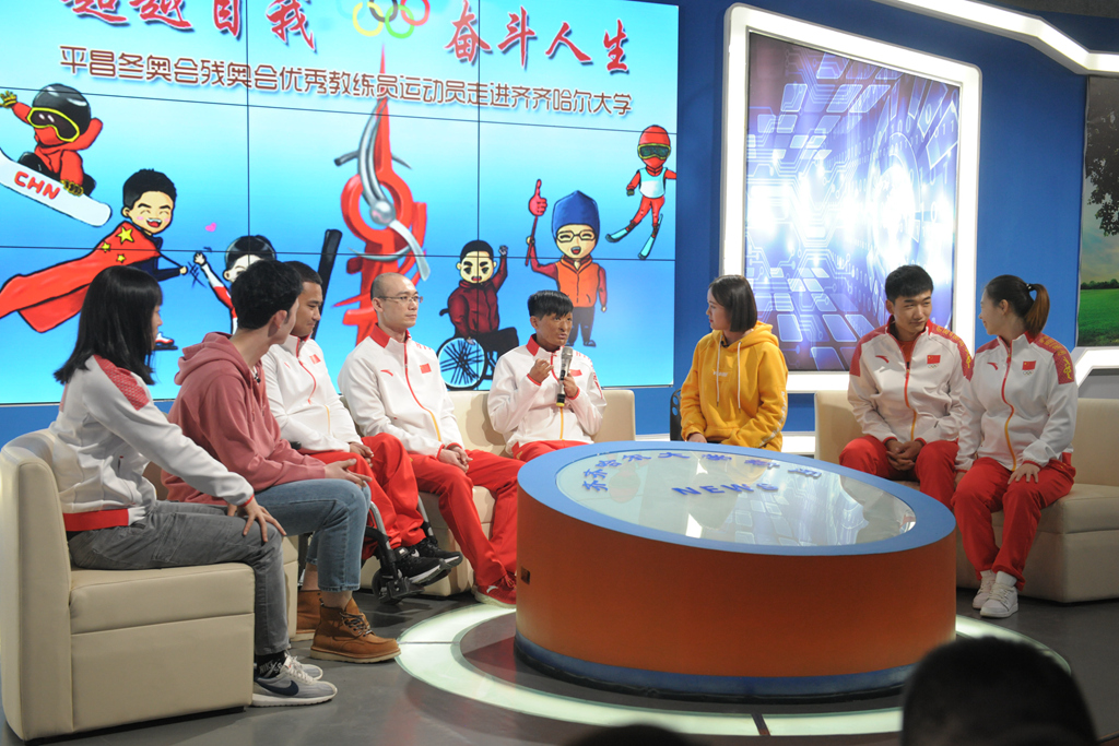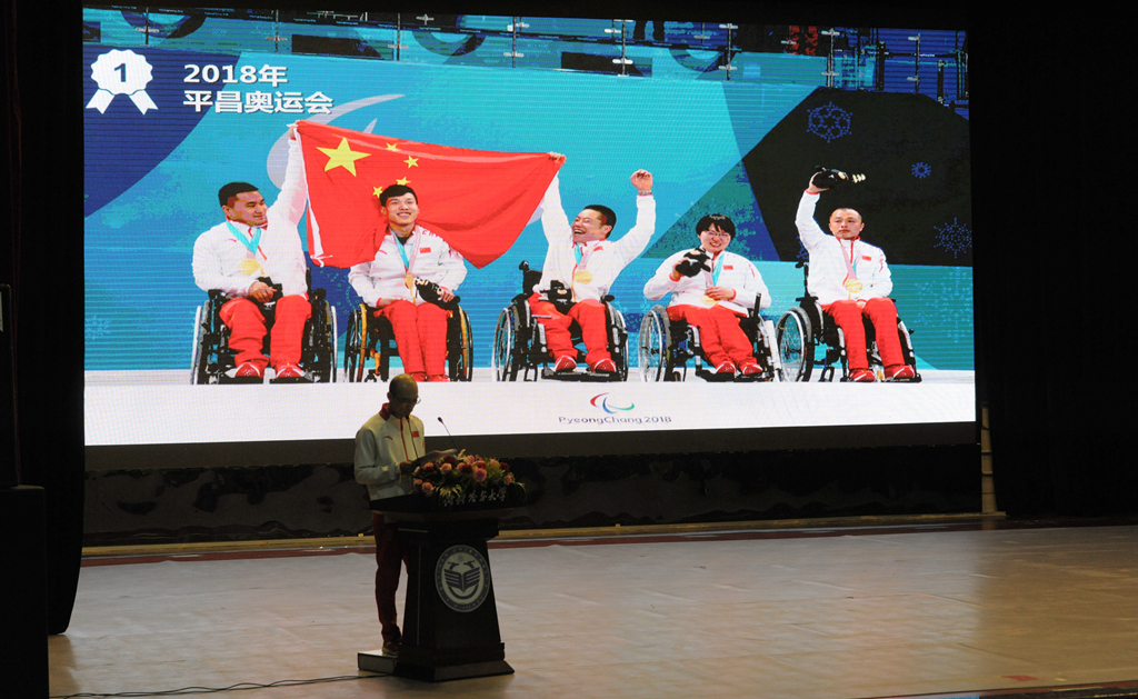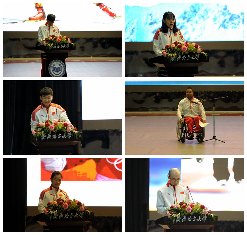 报告会上,平昌冬残奥会冬季两项男子站姿7.5公里短距离赛第八名吴君宝、单板滑雪队运动员蔡雪桐、男子500米铜牌高亭宇、轮椅冰壶冠军王海涛、自由式滑雪空中技巧队运动员孔凡钰、男子轮椅冰壶队教练员李建锐等6名优秀教练员、运动员分享了自己的成长故事、参赛感想和心路历程,讲述了他们在生活和运动生涯中的各种经历、磨难以及他们经过不屈不挠、顽强拼搏最终圆梦的感人事迹。台下师生被他们在为国争光过程中的艰辛付出和感人事迹所感动,被他们不畏艰辛、超越自我、勇攀高峰的精神深深鼓舞,会场上不时响起热烈的掌声。