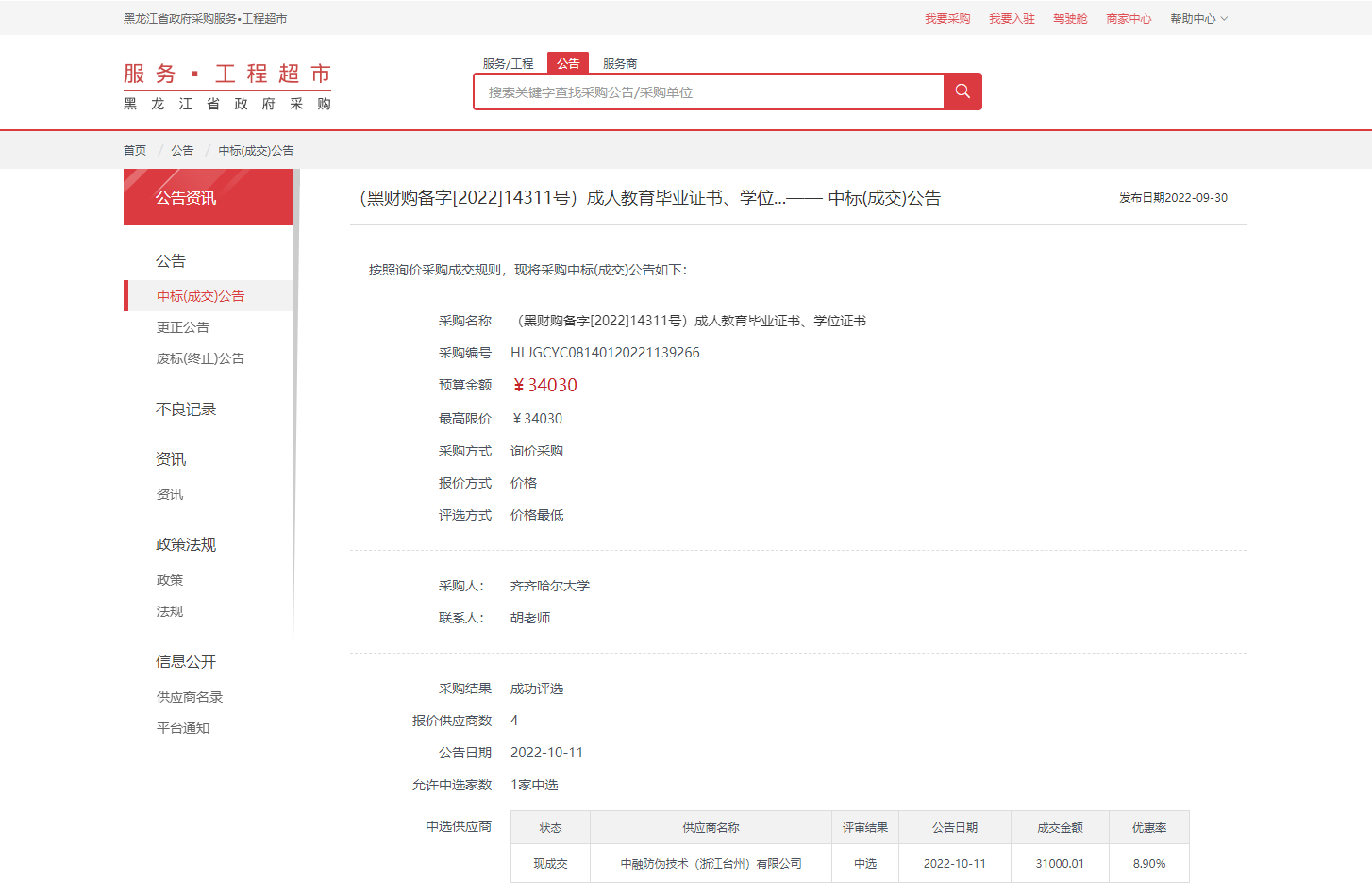采购名称(黑财购备字[2022]14311号)成人教育毕业证书、学位证书