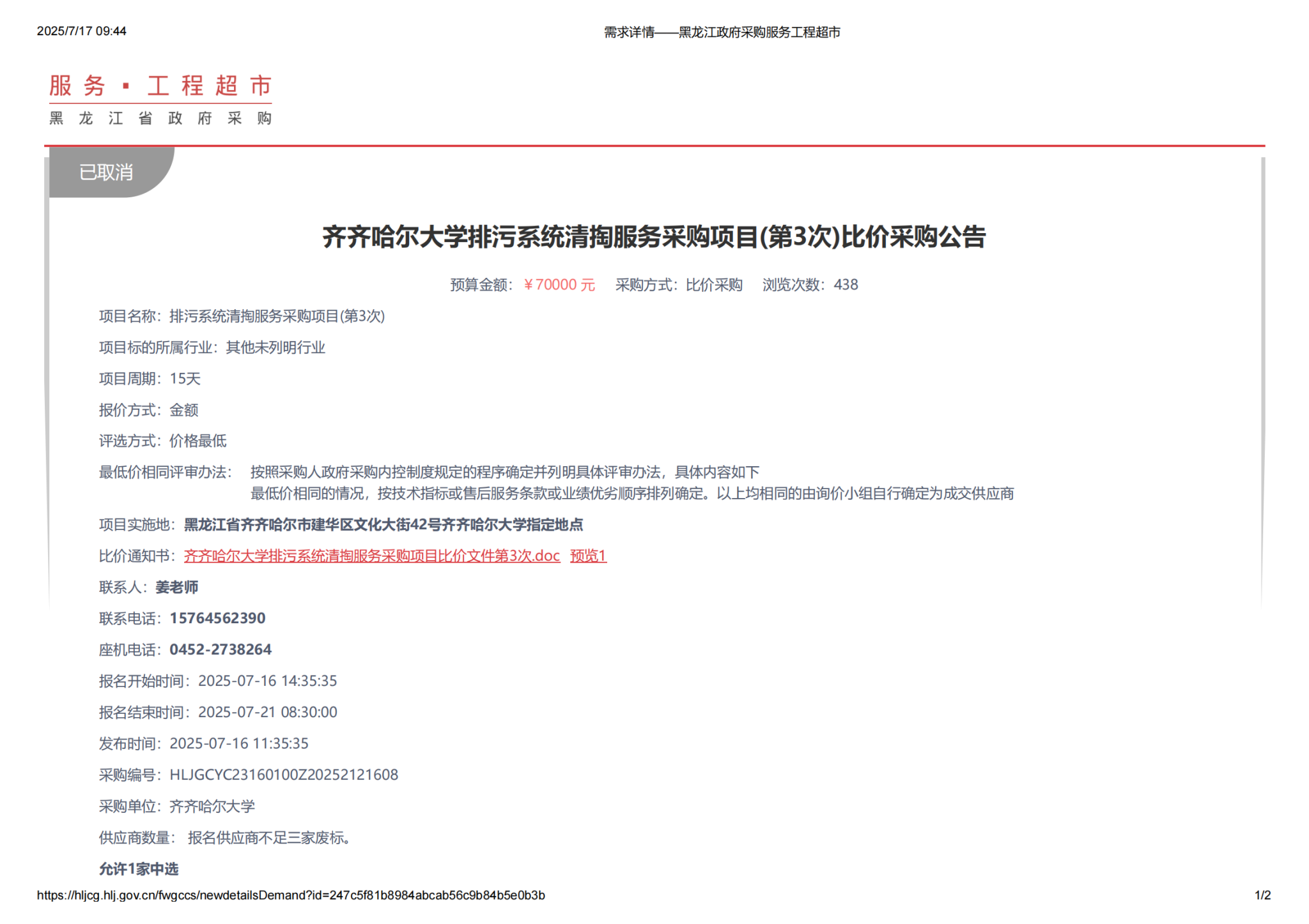 上一条:sunbet申搏官方网站排污系统清掏服务采购项目(第3次)比价采购公告0717(转自黑龙江省政府采购网)