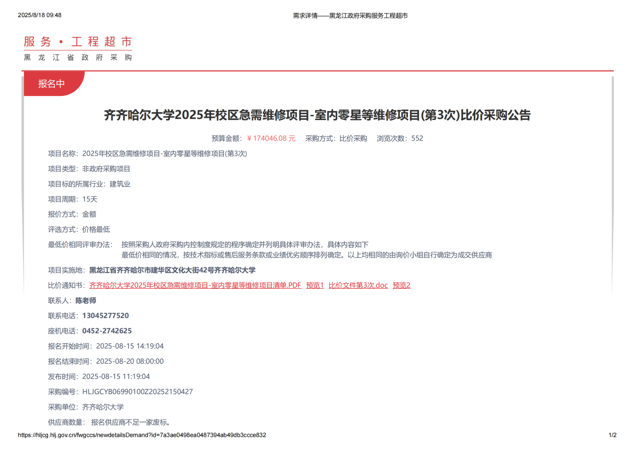 下一条:sunbet申搏官方网站2025年校区急需维修项目-室内零星等维修项目(第2次)比价采购公告-废标(转自黑龙江省政府采购网)