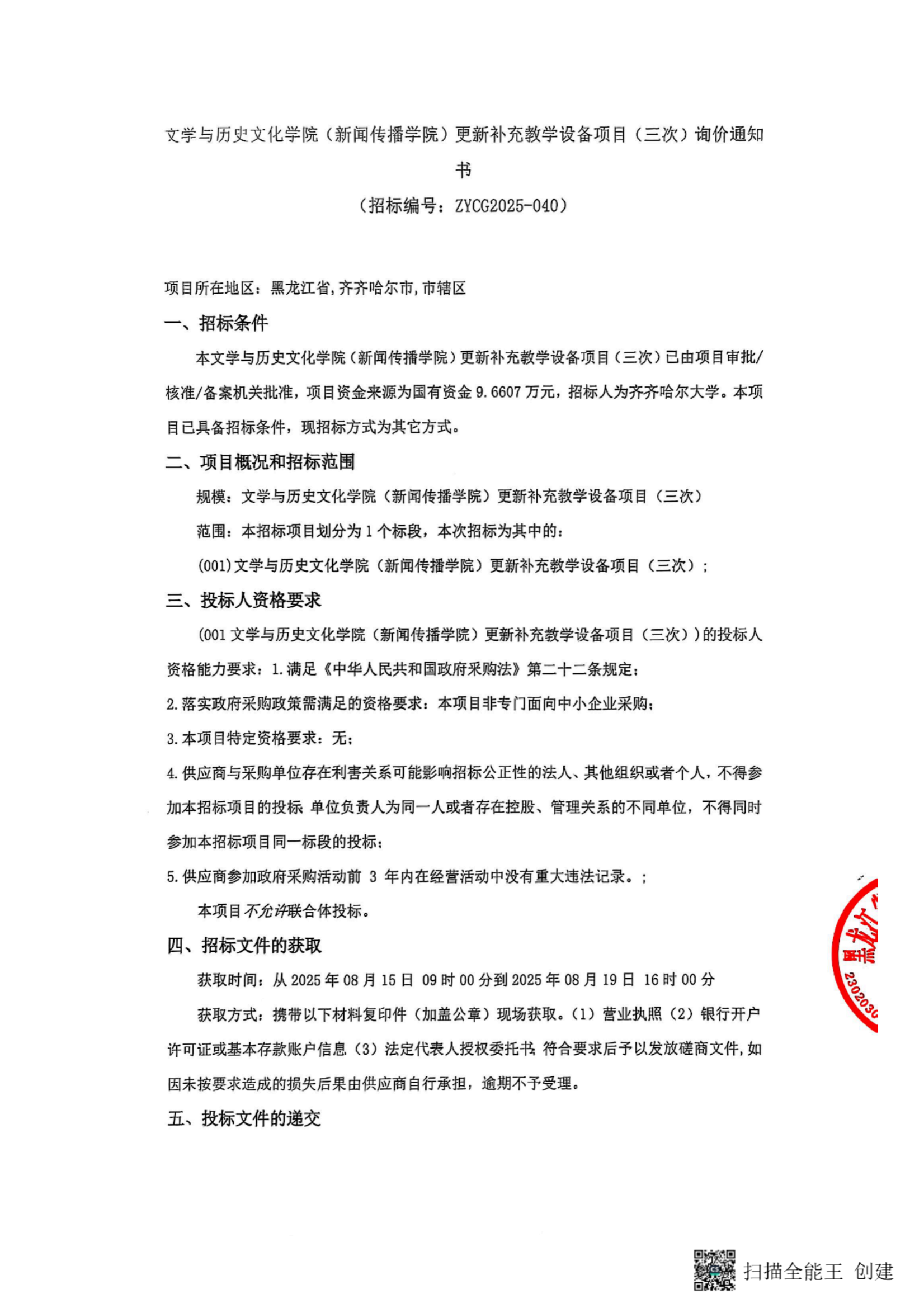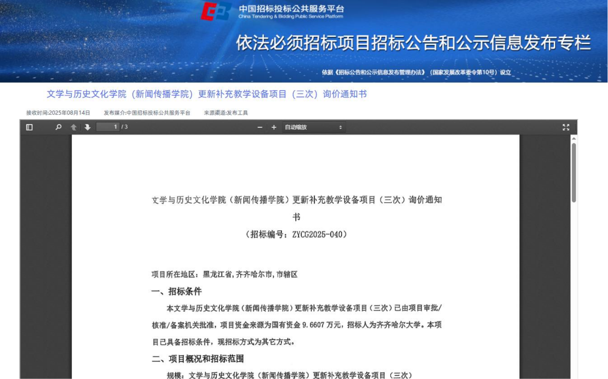 下一条:体育学院更新补充教学设备项目(三次)询价通知书(转自中国招标投标公共服务平台)