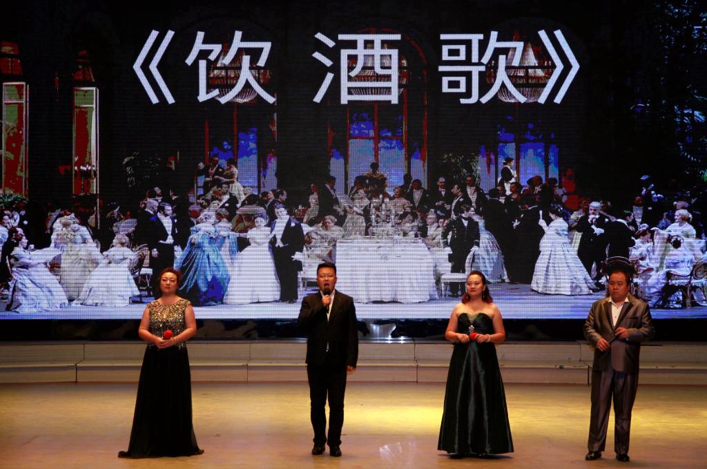 孙博、程丁、张白雪、冯翔琪四位老师为新生同学们带来了男女生四重唱《饮酒歌》,《饮酒歌》选自歌剧《茶花女》第一幕,唱出了男女主人公为青春、为美好爱情干杯,表达了他们对真诚爱情的渴望和赞美。曲调轻快优雅、旋律鲜明,博得现场同学们热烈的掌声。